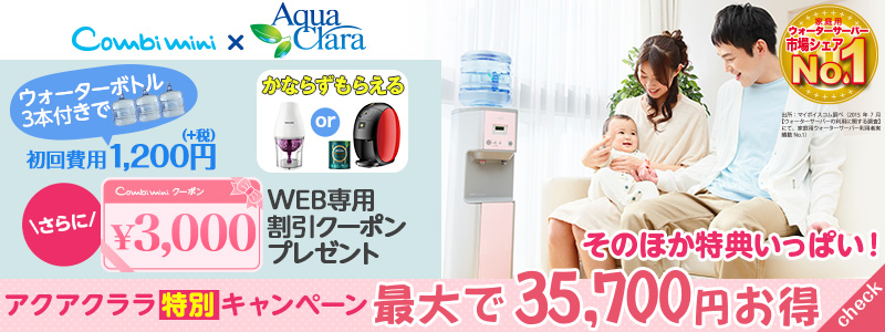 \おいしいお水がすぐ飲める♪/ 「アクアクララ」のウォーターサーバー コンビミニからお申し込みでWEB専用3,000円クーポンプレゼント!