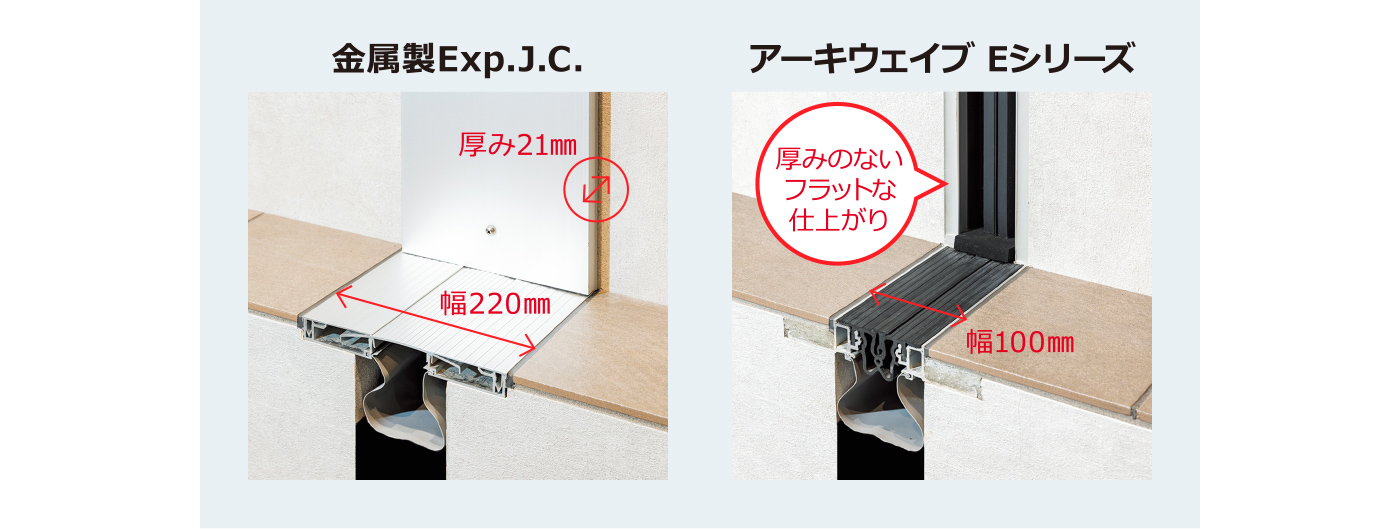 アーキウェイブは耐久性、耐侯性にすぐれた素材を採用したエラストマータイプの全方位追従型エキスパンションジョイントカバー(以下:Exp.J.C.)です。