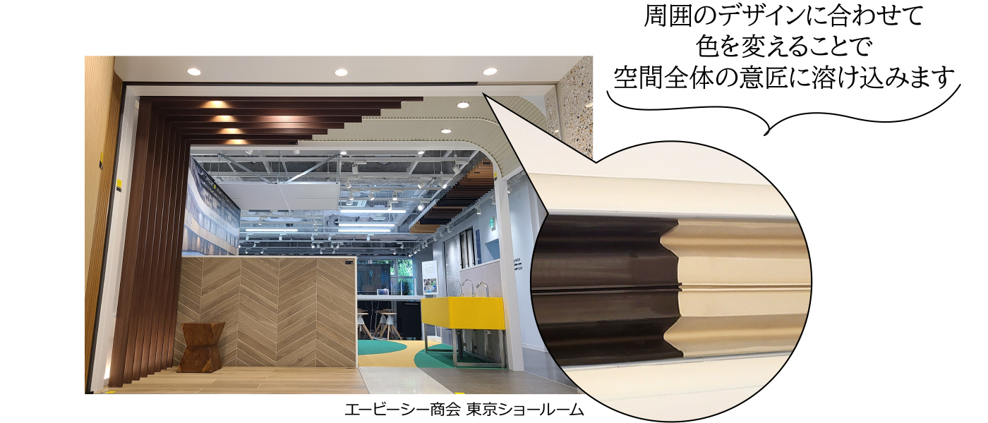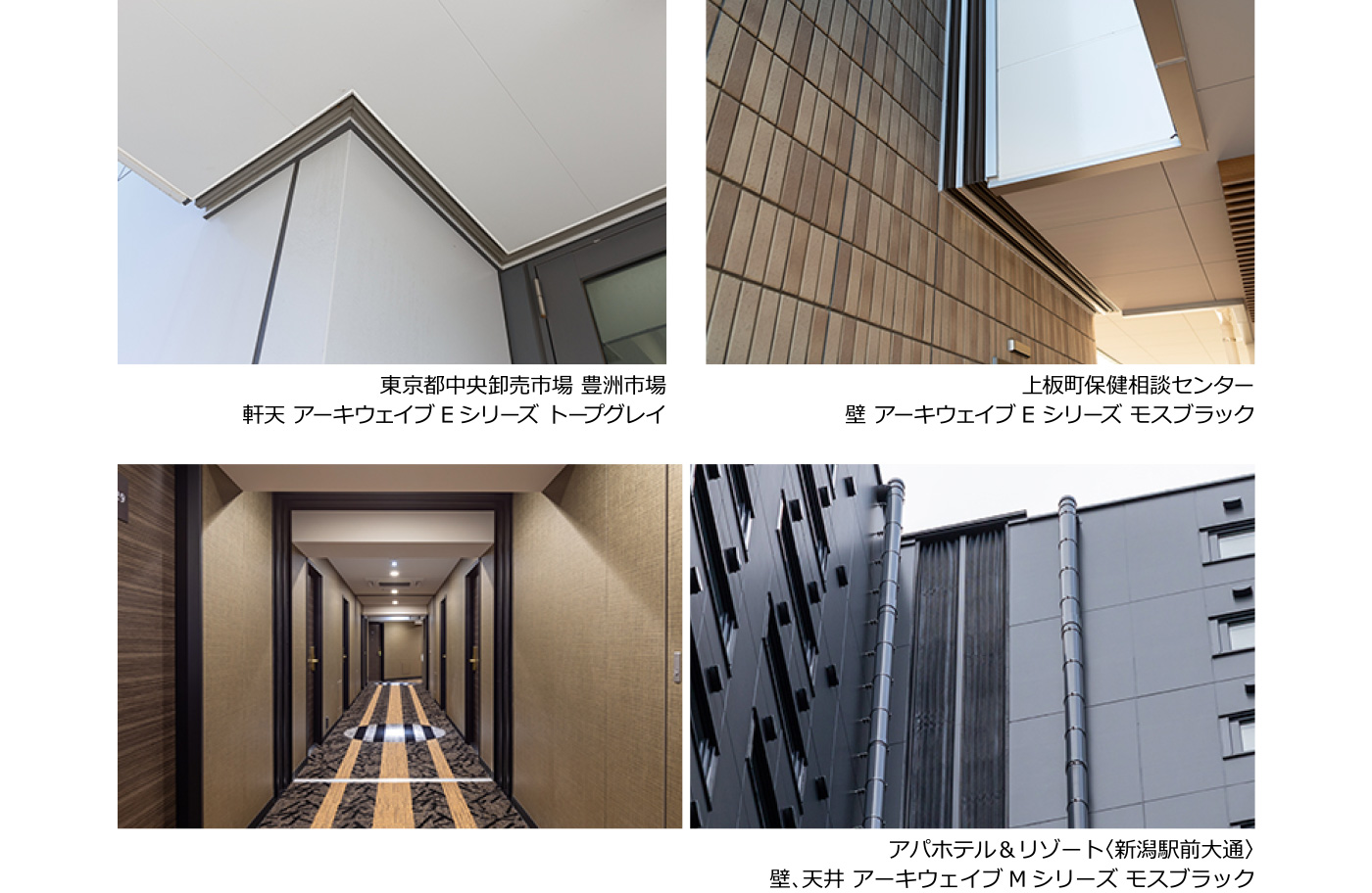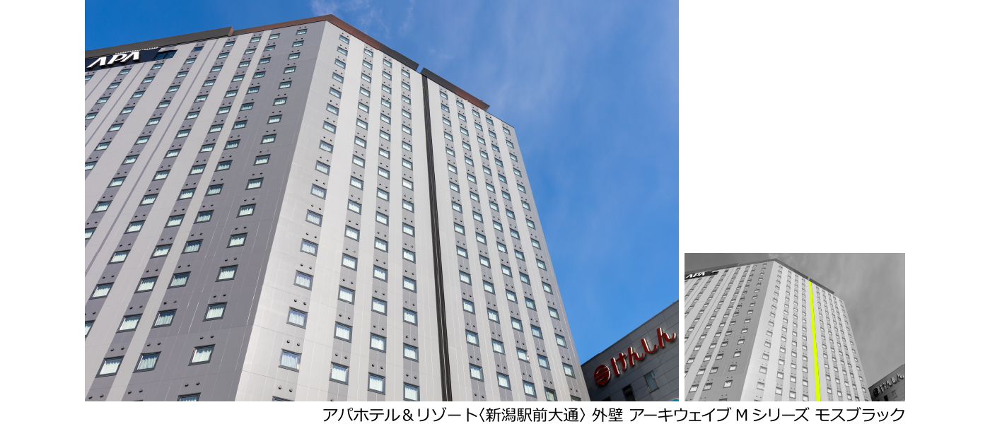 アーキウェイブは金属製Exp.J.C.と異なりクリアランスにすっきり納まります。壁面と同面になるので、写真の「アパホテル&リゾート〈新潟駅前大通〉」のように周囲のデザインを邪魔しない納まりが実現するのです。