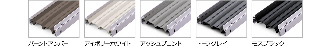 打ち放しコンクリートの壁にマッチしたモスブラック、木質系仕上げ材にも馴染むバーントアンバー…アーキウェイブはどのような空間にも自然に溶け込む5色を展開しています。 ※床タイプ、免震シリーズはトープグレイ、モスブラックのみ