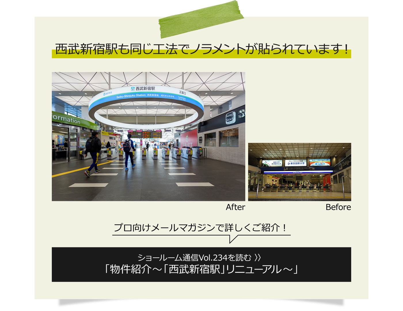 皆さんがよく利用する施設にはどのような仕上げ材が使われていますか? もしかすると、通学やお出かけの時に利用する建物の床・天井・カウンターはエービーシー商会の商品かもしれません。 そこで今回は東京と大阪からひとつずつ、駅周辺の施工事例をご紹介します!