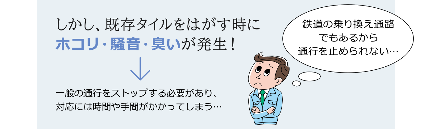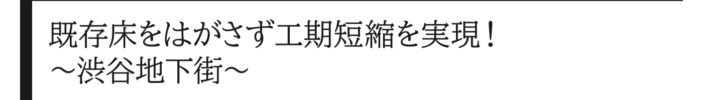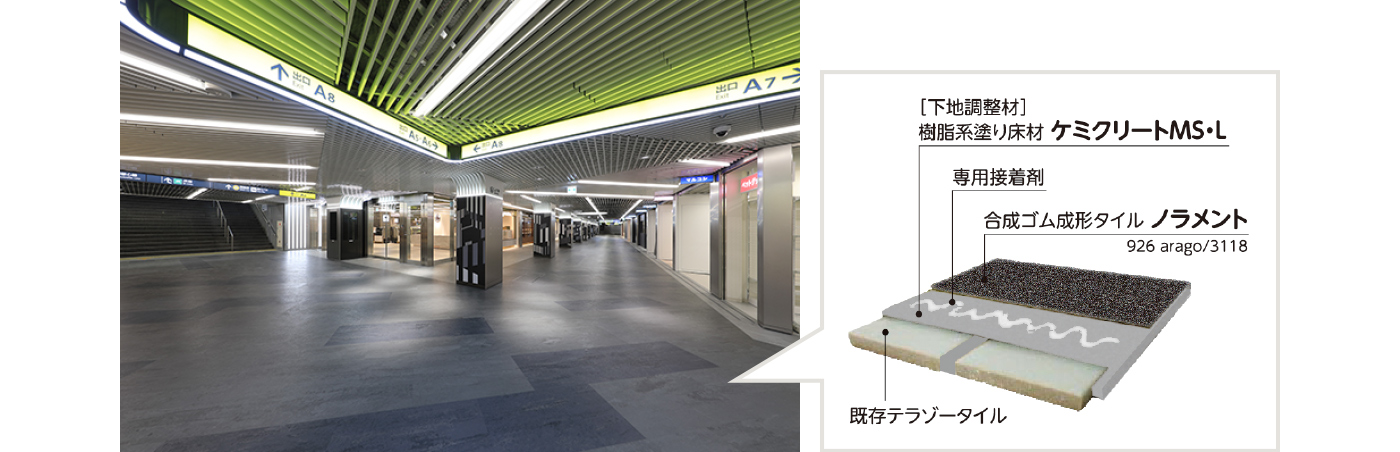 そこで、しぶちかでは速硬性の高い樹脂系塗り床材「ケミクリートMS・L」を既存床の上から塗って目地の段差をなくす工法が採用されました。既存の床をはがすことなくノラメントを重ねて貼ることができたため、終電から始発の短い時間での改修工事が可能になりました。