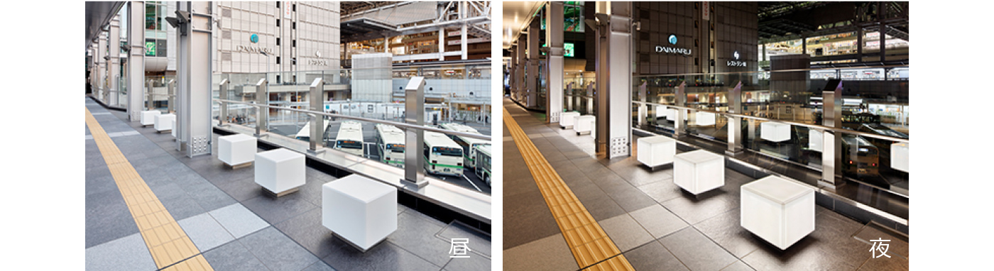 またコーリアンは光を透す色柄もあります。 スカイウォークのベンチはLEDが内蔵されており、ベンチそのものが光る仕様になっています。そのため、足を休めるためだけではなく、夜は照明の役割も果たして街行く人の足元を優しく照らします。