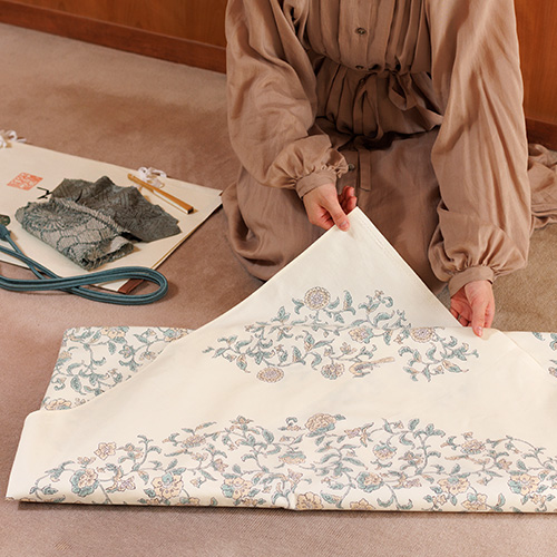 和装小物屋様はもちろん、ギフトショップや雑貨店様でもお取り扱いが増えている、145cmの「大判シリーズ」。その中でも「きもの包み」はテーブルクロスとして人気が高く、 ・「花鳥更紗の可愛さに一目ぼれ! 七五三で着物を包んだ後はクロスとして使いたい。」 ・「花唐草のパールが華やかで、生地もしっかりしていてクロスにぴったり。」 といったお声を多くいただいています。
