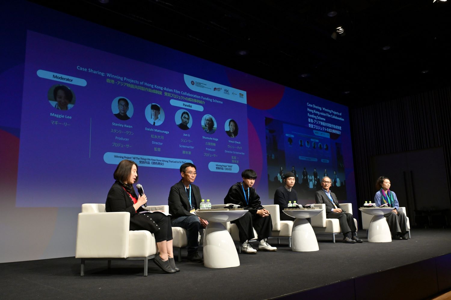Stanley Kwan, Daishi Matsunaga, Jun Li, Shunsuke Koga, and Vincy Cheung presented successful case studies of award-winning projects from the Hong Kong-Asia Film Collaboration Funding Scheme.