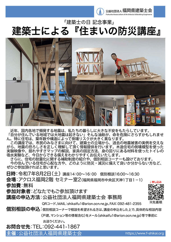福岡県建築士会(まちづくり委員会防災部会)が、全国で実施する「建築士の日」事業の一環として取り組んでいる「建築士による『住まいの防災講座 』 」のご案内です。