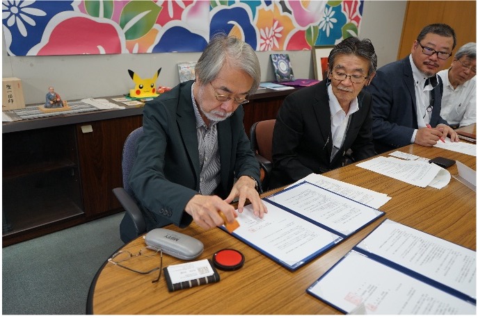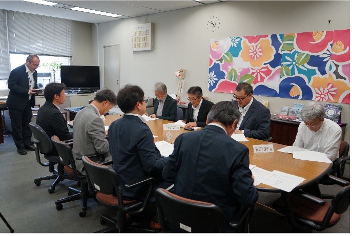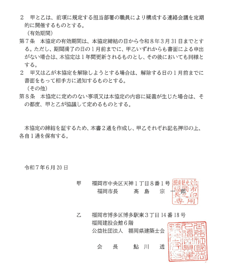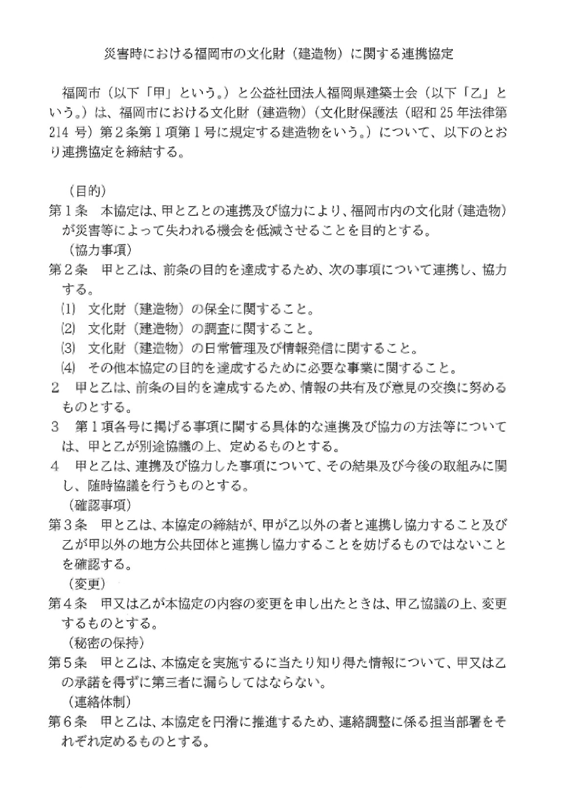 去る令和7年6月20日(金)10:30から、福岡市役所経済観光文化局にて『福岡県建築士会との災害時における文化財(建造物)に関する連携協定』の調印式が執り行われました。この協定は福岡市文化財担当部局と士会歴史的建造物委員会を担当部署として、災害等で失われる文化財を保全するために結ばれました。その実現の為に災害時の調査・所有者への助言、罹災前の文化財リストの充実、日常管理や情報発信への協力、等を行うものです。 調印式は定刻より遅れて福岡市文化財活用課調査普及係長宮野弘樹氏の司会で行われました。 参加者は福岡市から経済観光文化局吉田宏幸局長、経済観光文化局富田雅志理事、経済観光文化局文化財活用部白石雅俊部長、経済観光文化局文化財活用課松村利規氏課長、経済観光文化局文化財活用課調査普及係宮野弘樹係長、経済観光文化局文化財課調査普及係黒田有花氏、県建築士会から鮎川透会長、歴史的建造物委員会中島孝行委員、歴史的建造物委員会専門部会花吉朝陽部会員、長谷川保宏事務局長。まず、名刺交換が行われ、その後松村課長により協定内容の説明が協定書一条、二条を中心に行われました。次に押印に移りましたが、市長印はあらかじめ打たれており建築士会印を鮎川会長が押印しました。その協定書を掲げて記念写真を黒田氏の撮影で行いました。その後鮎川会長、吉田局長による文化財が少しでも失われない様協力していくとのご挨拶があり、閉会いたしました。協定書も以下に掲載いたします。