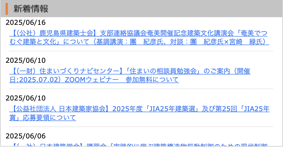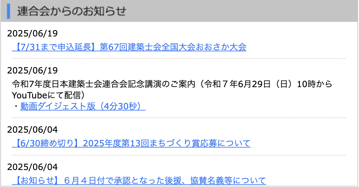 「日本建築士会連合会 HP」トップページの下段に「連合会からのお知らせ」「新着情報」が掲載されていますのでご覧ください!(2025/6/20 現在)