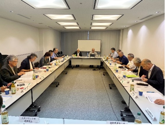 令和7年6月19日、標記の会議が開催されました。鮎川会長とともに出席したので、議事等を報告します。 会議は、例年九州ブロック研究集会「集い」の前日に開催されています。今年の集いは福岡市での開催なので、この会議も福岡市での開催となりました。 会議は、九州ブロック会を代表して副会長・中野長崎県士会会長の挨拶で始まり、開催県会長として鮎川会長が、連合会会長として古谷会長が挨拶されました。いずれの挨拶でも、厳しい財政状況や会員減少などをふまえた課題への取り組みの必要性についてふれられています。
