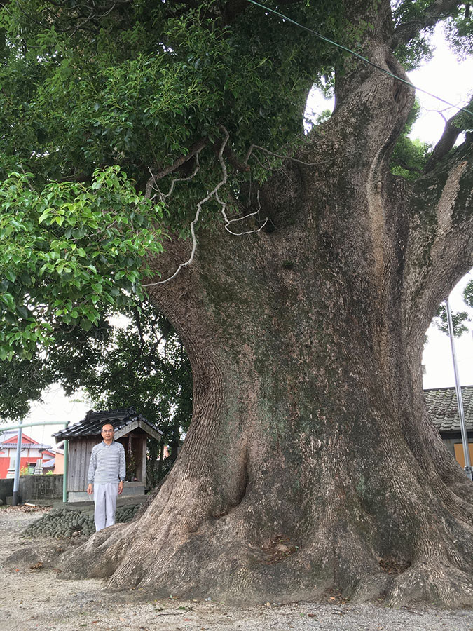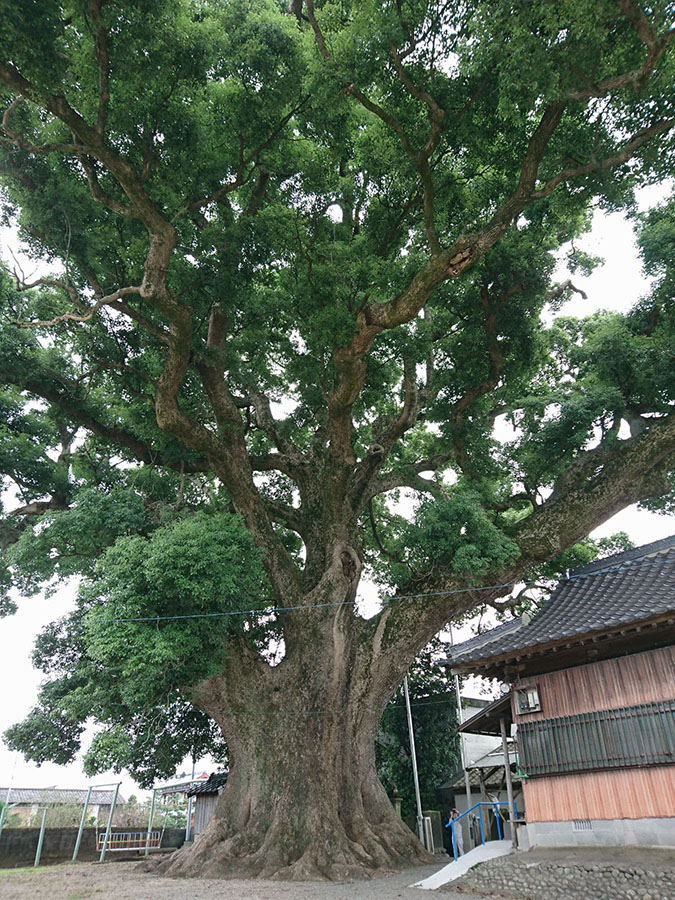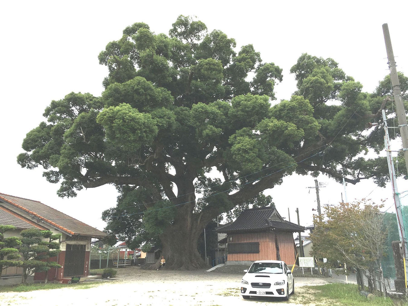 朝倉市の国道386号を比良松の交差点を朝倉インターの方に曲がり、ひわたし橋の交差点を三連水車方向に左折して、しばらく進むと大きなクスノキが見えてきます。現地の看板によると、推定樹齢400年~900年、胸高囲13.3m、高さ26m、枝張り(東西)42.0mと全国ランキング並みの大きさです。こんなに立派な巨木なのに天然記念物には指定されていないとは驚きである。地元の集落の方々が毎月17日に境内の観音様、お大師様、お地蔵様にお神酒を奉納して、最後にクスノキにもお神酒をあげるのが慣わしらしい。