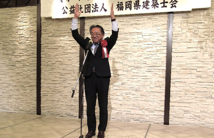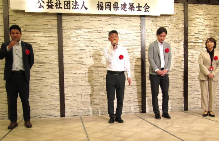 懇親会では、柴田副会長の開会の辞で始まり、鮎川会長の会長挨拶、来賓紹介に続き、ご来賓を代表して、福岡県建築都市部建築指導課の江頭 美紀課長、公益財団法人建築技術教育普及センター九州支部の髙山 裕明事務局長より来賓挨拶を頂戴して、一般社団法人建築構造技術者協会九州支部の重松 正幸支部長の乾杯のご発声により宴会が始まりました。賛助会の皆様のご紹介が行われ、にぎやかな時間が過ぎ、一般社団法人福岡県建築士事務所協会の西 洋一会長の万歳三唱のご発声があり、上田副会長の閉会の辞により懇親会は終了となりました。